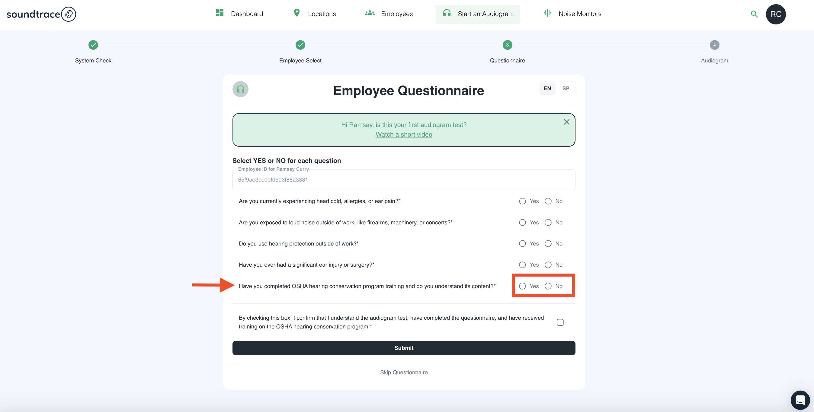 How is record of the training being watched by the employee? \nAs part of the pre-audiogram testing workflow, there is a questionnaire that asks the employee if they have received their OSHA required training on the hearing conservation program.