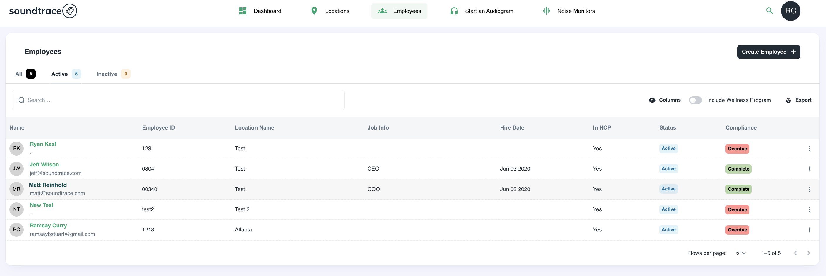 1) To export an audiogram in Soundtrace platform, navigate to 'Employees' on the top menu. Use the search bar to find the employee to find the employee. Find the employee needed and click on the specific employees name.