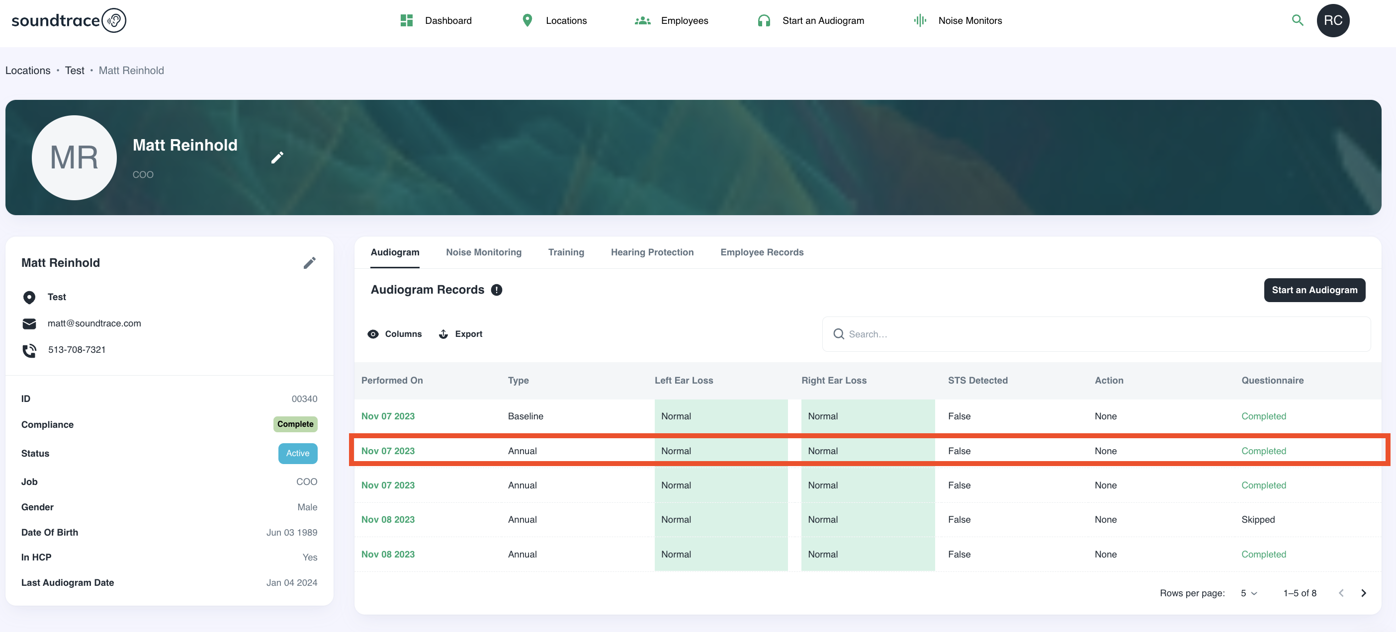 2) This will pull up the employee profile. From here under Audiogram Records, click the performed data of your choosing.